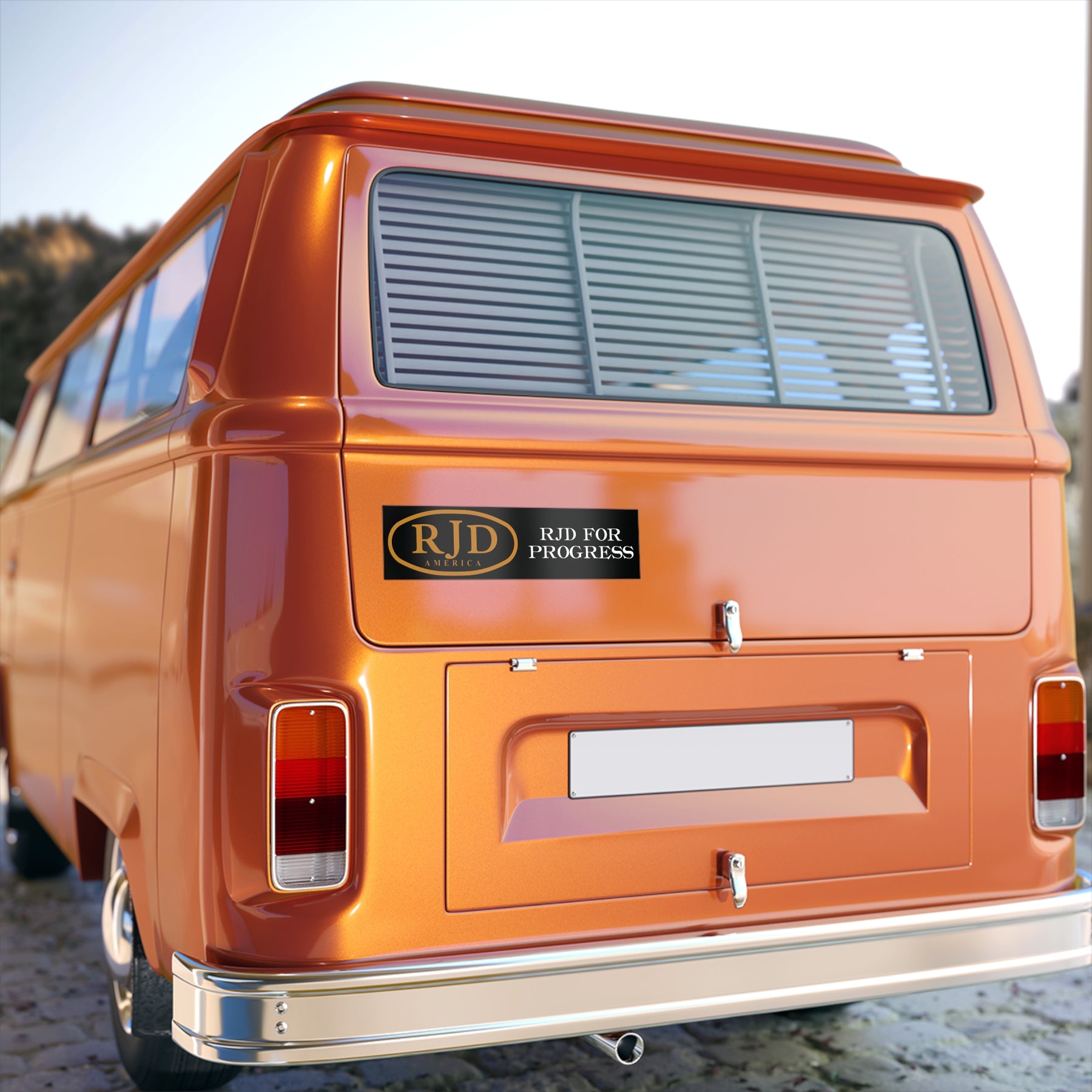 A sleek, matte bumper sticker that reads “RJD for Progress” with a classic oval RJD America logo in gold-on-black. The design feels formal and steady — the kind of sticker that adds a measured, confident accent to a vehicle, laptop, or toolbox. The matte finish and UV-protective laminate keep colors deep and glare-free while the premium vinyl and waterproof adhesive stand up to rain, sun, and road grime. Easy-peel backing makes application quick; the sticker settles flat and stays put, maintaining its crisp look through everyday wear.