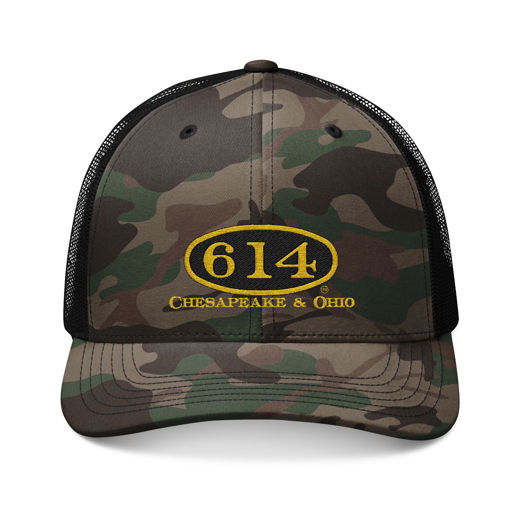 Stay cool and stylish with this Camo Trucker Hat featuring the '614 Chesapeake & Ohio' embroidered mesh cap. Perfect for outdoor enthusiasts, truckers, and those who love a rugged aesthetic. Ideal for casual wear, camping trips, and outdoor festivals.