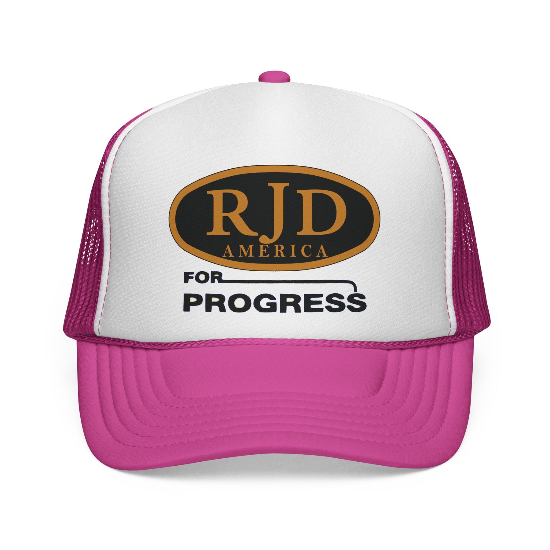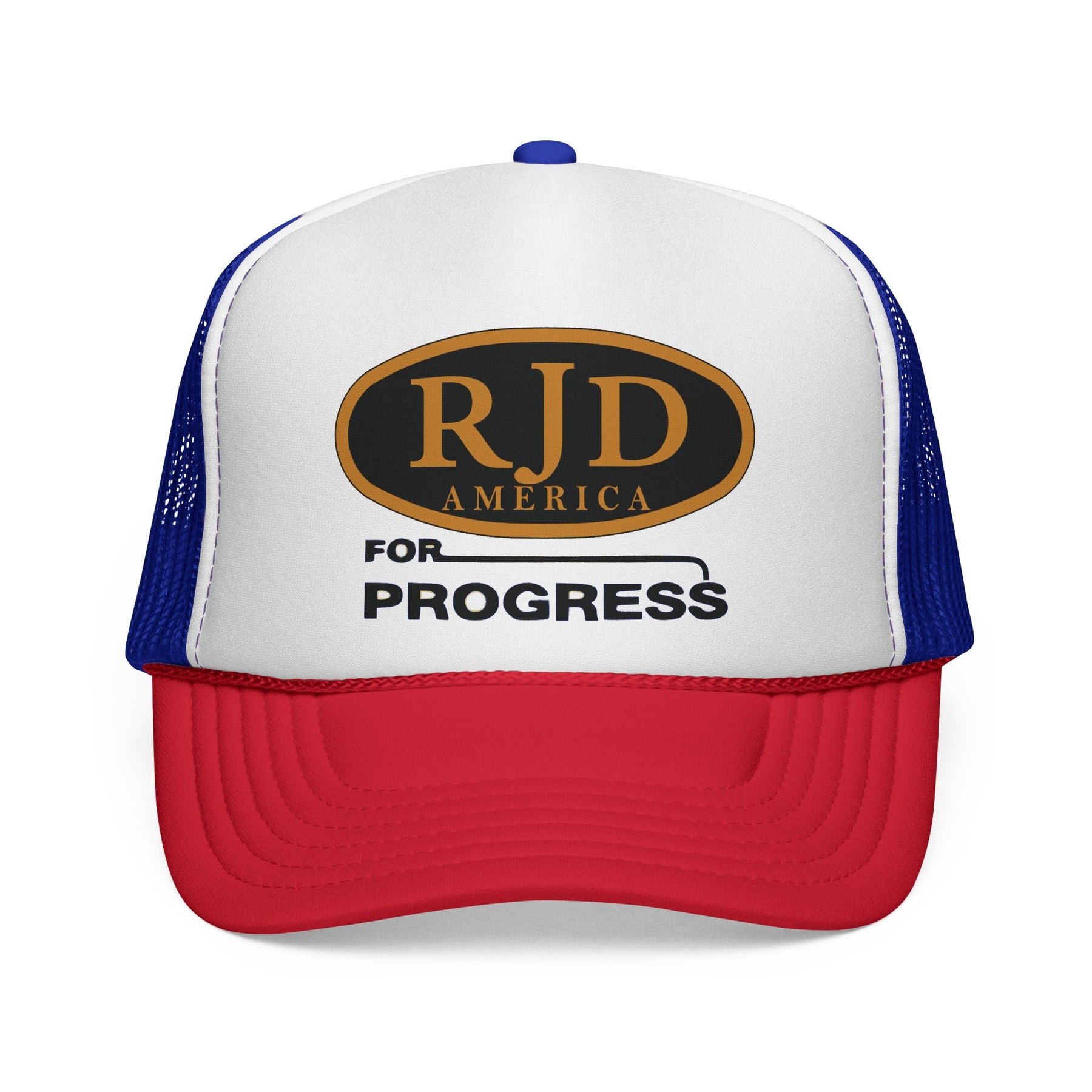 Lightweight, breathable, and unapologetically bold — this mesh snapback carries the RJD America 'For Progress' statement where workdays, rallies, and weekend drives meet. The structured foam front holds the design crisp and forward, while the nylon mesh back keeps airflow steady when the sun or the crowd turns up the heat. It sits low and confident on the brow, color-matched details giving a finished look that reads as intentional, not accidental. Wear it on city streets, at community meetups, or on a long ride; the cap settles in and becomes part of your rhythm, signaling someone who cares about momentum and shows it outwardly.