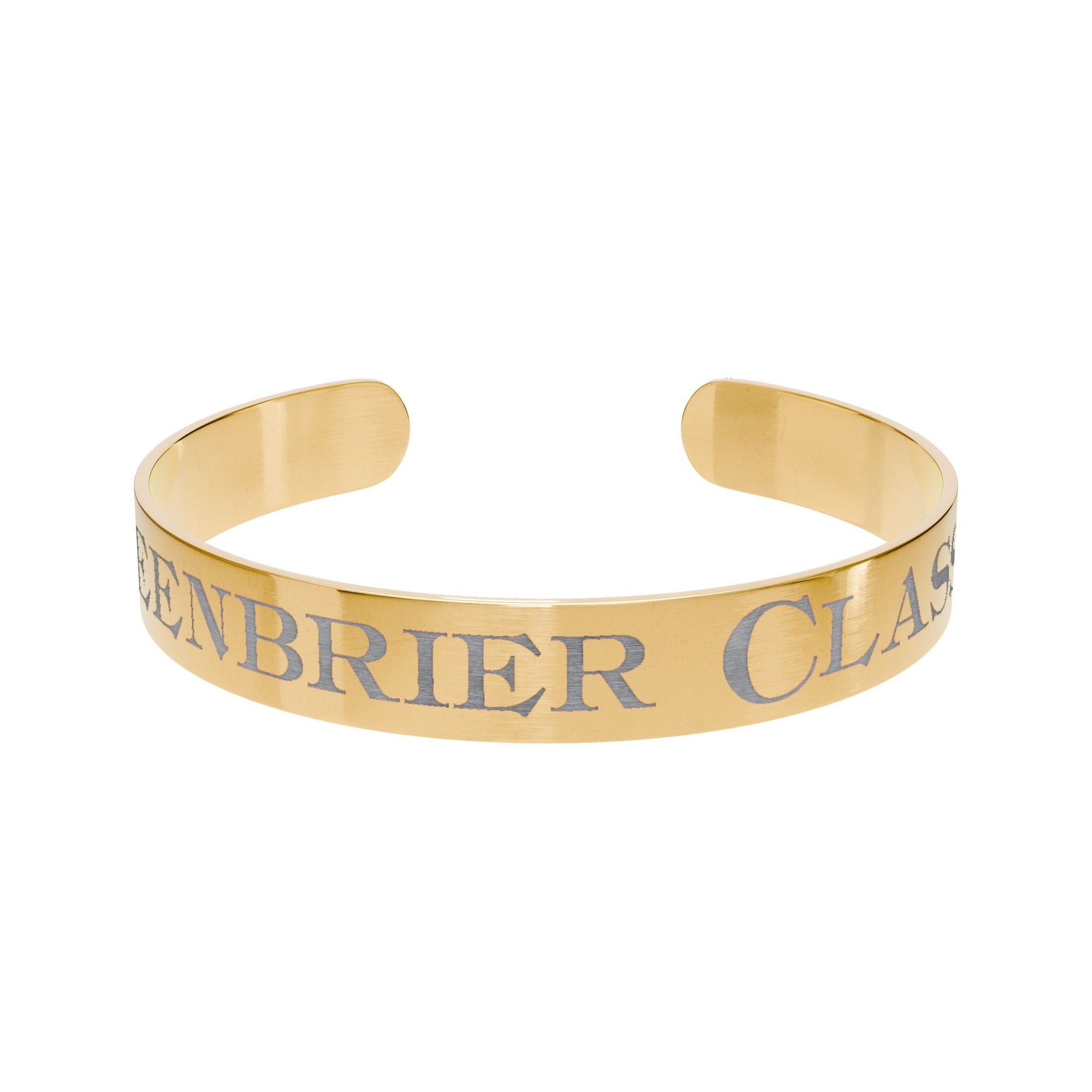 A slim, engraved rose-gold cuff that reads "614 Greenbrier Class J-3a," finished into an open bracelet you can slip on instantly. The engraving is done while flat for crisp detail, then formed into a comfortable arc that sits close to the wrist. It carries a warm, brushed rose-gold tone over surgical-grade 316L stainless steel with a durable PVD coating, so the color and shine hold up through daily wear. Lightweight and hypoallergenic, it feels gentle against skin while standing up to the knocks of everyday life. Packaged in a white gloss jewelry box with non-tarnish cotton, it arrives ready to wear or present.