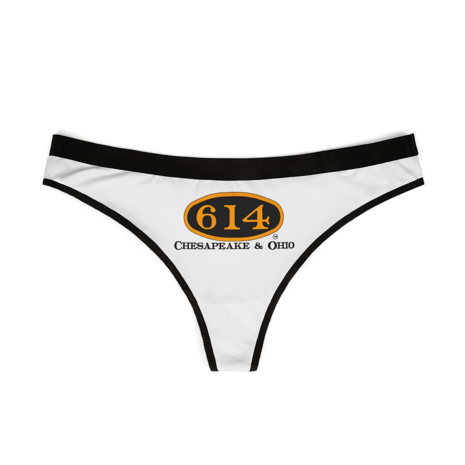 Slip into a little secret that speaks to hometown pride. These lightweight thongs sit low and sleek, the soft white fabric framed by contrasting black edges. A vintage-style oval badge with “614” and “Chesapeake & Ohio” rests at the center front—a subtle nod to railroad heritage and local identity. Wear them under fitted jeans for a no-lines finish, or pair with a casual dress when you want a confident, quiet reminder of where you belong. Breathable, stretchy, and low-profile, they move with you and fade into the background while letting a small, meaningful detail take the stage.